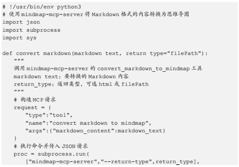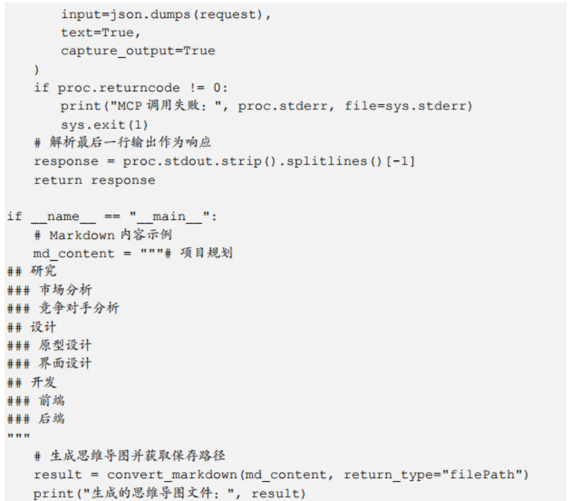 该脚本通过 Python 的 subprocess 模块调用已安装的 mindmap-mcp- server 命令,向 MCP 服务发送 convert_markdown_to_mindmap 工具调用请求,并根据—return-type 参数获取生成结果:当该参数为 filePath 时返回文件保存路径,用户可直接在浏览器中打开以查看交互式思维导图。