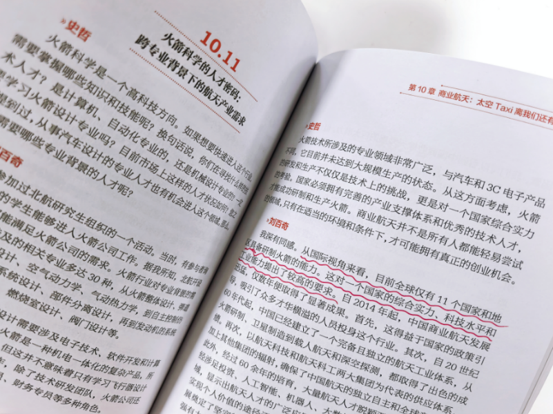 第二,文科、理科和工科的融合。王鹏更多从理论和人文角度提问,关注技术的本质和社会影响;而史喆更多从产业和应用角度切入,关注技术如何落地和创造价值,共同构建了一个更全面的知识框架。例如,这种互补性在与王剑飞讨论生物医学工程时表现得尤为明显。王鹏关注的是“医工交叉”的学科本质和技术原理,而史喆更关注医疗设备的产业化和规模应用。在“商业航天”一章,王鹏提出了关于太空科技普及的问题,而史喆关注火箭发射的商业模式和产业链构建。