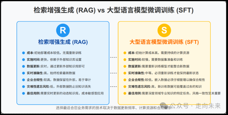 以下表格比较了RAG和LLM再训练在成本、实施时间、数据更新频率和最佳用例等方面的关键因素。在你的应用场景中,你会选择用哪种方式呢?