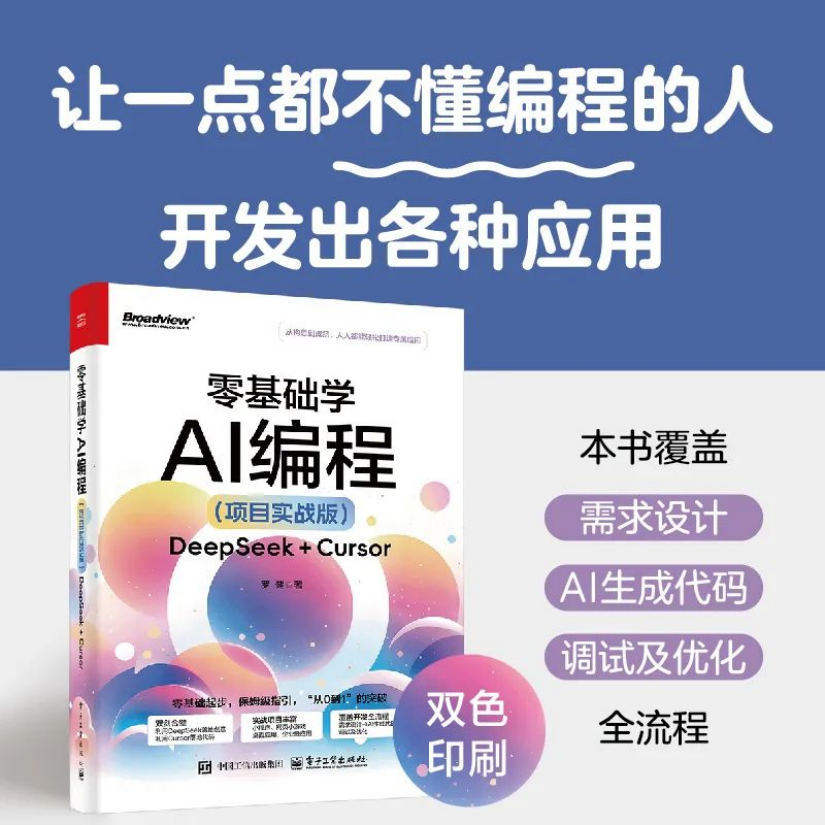 今天,为你介绍一本颠覆性的实战指南——《零基础学AI编程(项目实战版):DeepSeek+Cursor》。这不是一本传统的编程教科书,而是一把开启“所想即所得”开发新时代的钥匙!它聚焦于当下最强大的AI编程组合之一:DeepSeek(需求设计) + Cursor(代码生成)。