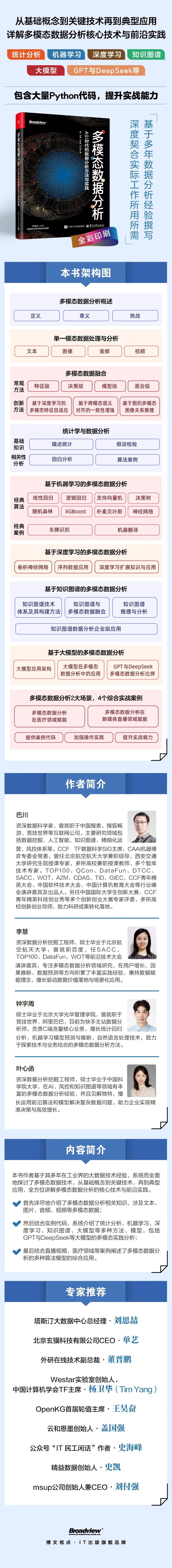 其七,拥抱大模型,紧贴时代脉搏:特别设立章节深入探讨 GPT、DeepSeek等顶尖大模型在多模态分析中的应用架构与实践。理解这些前沿模型如何驾驭多模态数据,是把握未来技术趋势的关键!读懂领先者的技术,能让我们站在更高的视野理解行业生态与发展方向。