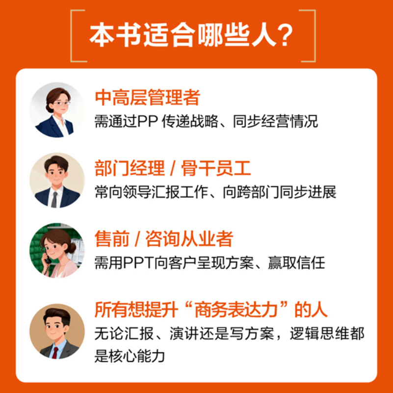 市面上谈PPT的书不少,但多聚焦在“操作技巧”;而本书的核心,是解决商务汇报的“本质问题”:如何让 PPT 成为“传递观点、推动决策”的载体。这种差异化价值,源于作者近 20 年的实战沉淀。