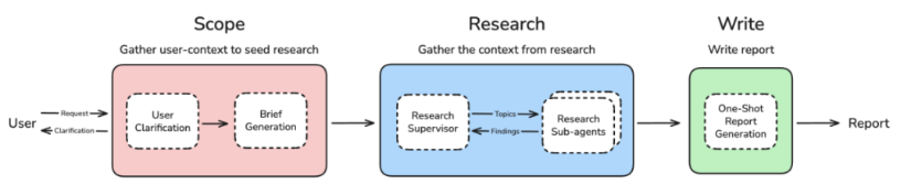以 LangChain 团队基于 LangGraph 开发和开源的 Open Deep Research[5] 项目为例,展示上下文管理策略的动态调整过程。
