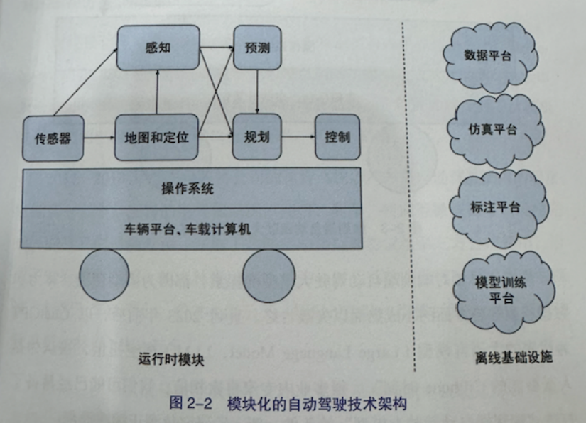 与机器人的技术架构一样,自动驾驶也常被分为硬件、软件和平台三大模块,可以理解为一种分层的、模块化技术架构;随着人工智能的发展,另一种技术架构——端到端自动驾驶大模型也逐步清晰,第一个端是输入,接收传感器信息,第二个端是输出,直接给出车辆控制信号。
