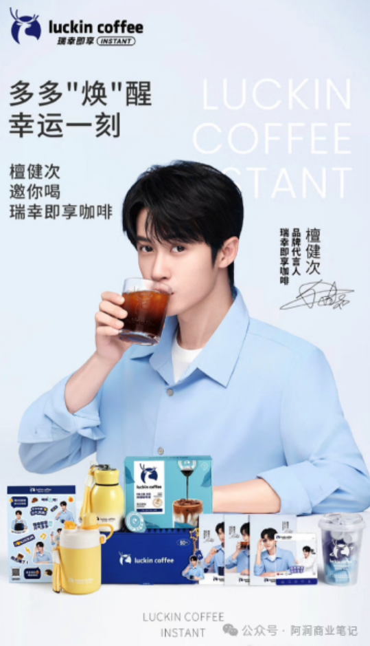 与此同时,瑞星开始从昂贵的大明星代言(张震、肖战等)转向大量轻量级的联名和素材 AB 测试:周边风格、数字呈现、文案位置都通过数据回流不断迭代,甚至会在广告里写“椰子风味较生椰拿铁提升 14.9%”这种极其数字化的文案。