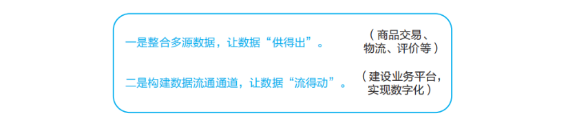 (2)构建数据流通通道 :建立商贸领域的线上综合服务平台,实现交易、履约、仓储、物流、资金结算和信贷融资等环节的数字化,确保贸易全过程的可追溯性和可还原性,便于产业链上下游企业的数据交互。