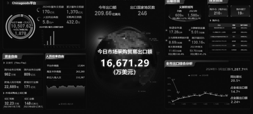 2023 年,义乌出口总值达到 5005.7 亿元,使用小商品数字自贸平台提供的报关、物流或结汇等数字化产品服务的占比达 77.6%。全年基于企业征信体系累计授信总额为 90.57 亿元,放款额为 35.58 亿元,解决 3.3 万余家小微企业融资问题。通过市场采购贸易方式出口 3883.7 亿元,同比增长 19.0% ;通过海关跨境电商管理平台进出口 166.0 亿元,同比增长 93.0%。义乌市场电商主体突破 60 万家,日均新增超 500 名电商“老板”,领跑全国。