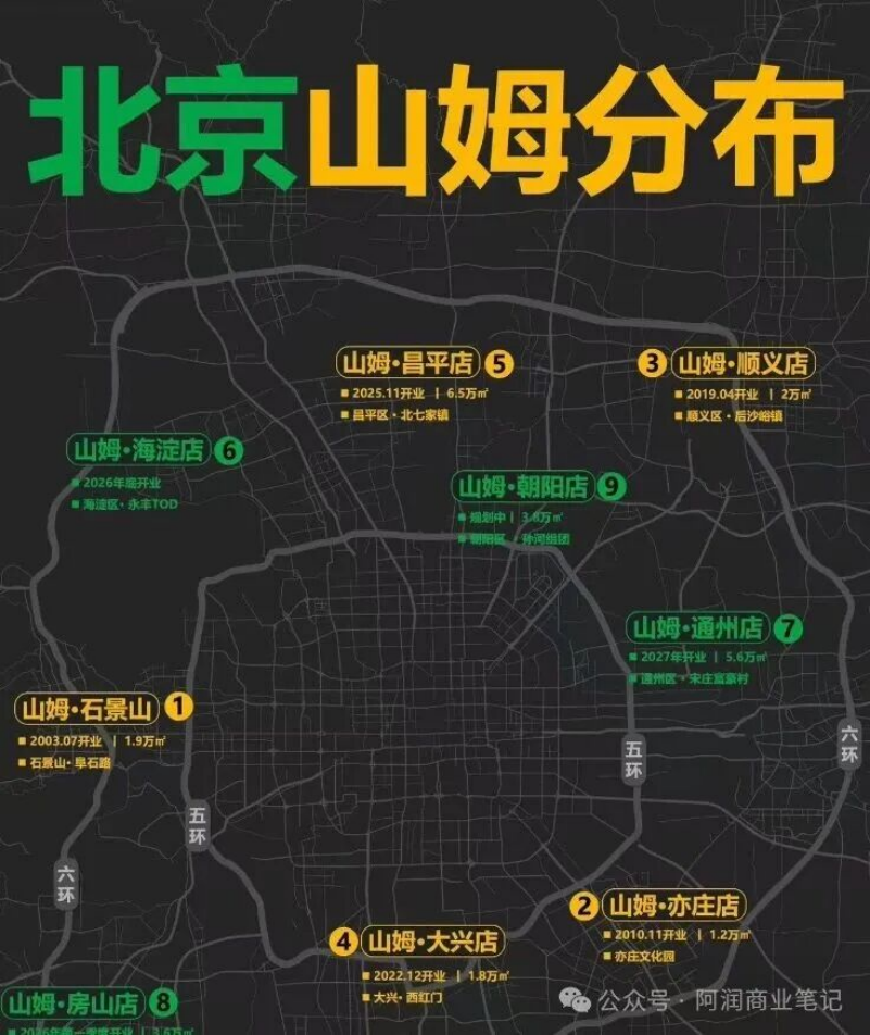 与2019年才来中国的开市客不同,山姆在1996年就来到了中国,已经在中国大陆开出了60家门店,以北京来说,城市的各个方向几乎都有建成或者即将建成的会员店。几乎做到了覆盖这个城市所有的中产用户。