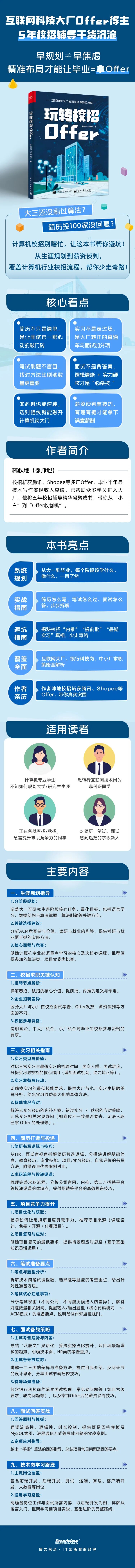 现在市面上,还没有这种系统的校招求职指导的书籍,如果你未来需要求职,无论你是科班还是非科班,如果你想要求职互联网,哪怕是非技术岗位,这本书都可以给你带来很多帮助;而如果你是要求职技术岗位,那么你必须买一本放枕头边。