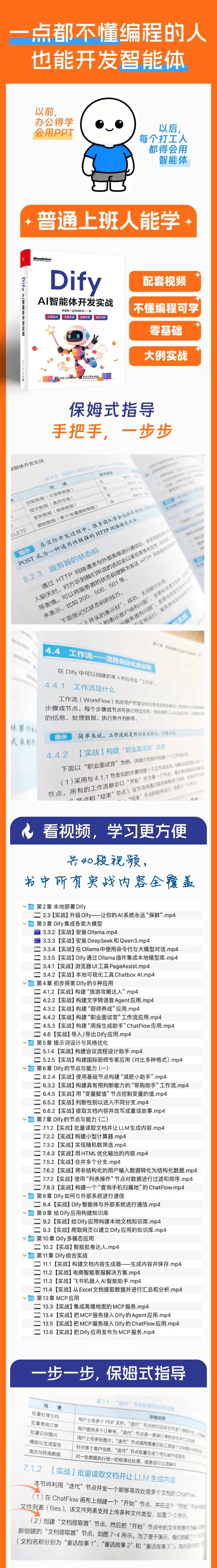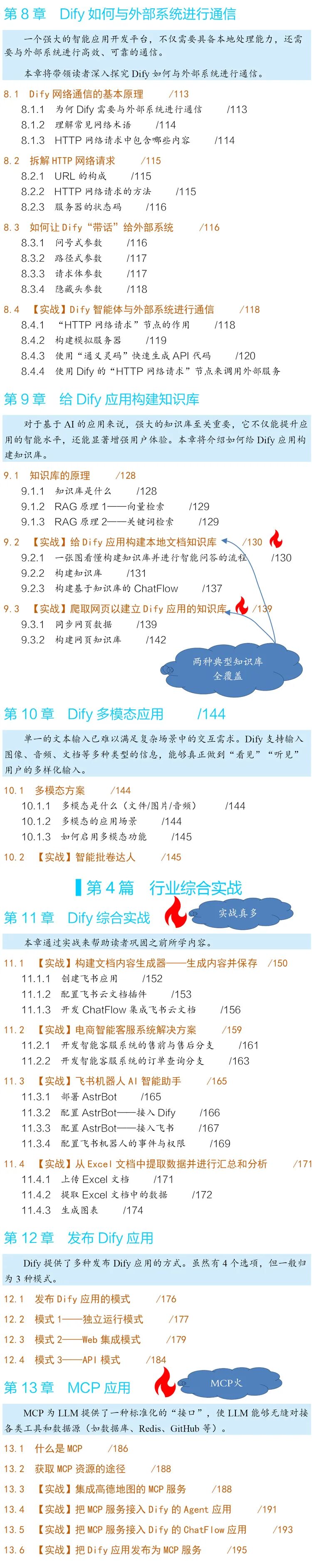 全书系统梳理Dify核心功能,从基础部署、大模型集成,到提示词优化、多模态应用、外部系统通信,再到行业实战与应用发布,学完就能应对绝大多数AI智能体开发场景,无需再拼凑零散教程。