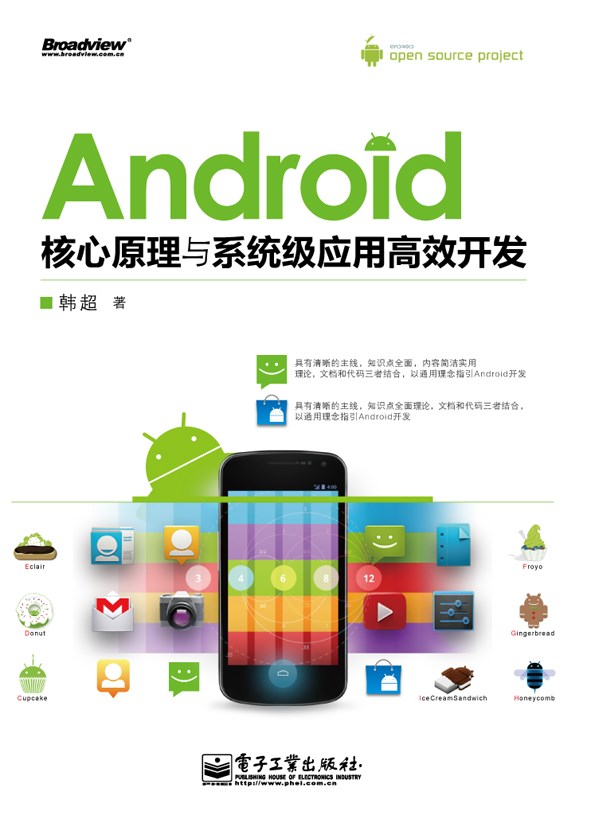 Android核心开发的教程,主要目标是让Android各个方面开发者更深入地理解Android系统,让开发的过程更正确、更有效率。本书主要由两个大部分组成,前篇自下而上介绍Android核心框架层的结构,并将开发的技巧和要点蕴含于其中;后篇较偏重系统级的应用层,关注Android开发过程中的重点方面。