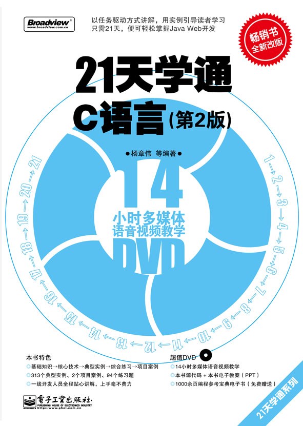 本书是C语言的入门教程,详细介绍了C语言的基本概念和编程技术。本书分为八篇,共21章内容。第一篇为C语言入门篇,该篇介绍了C语言程序的特点及编程的准备。第二篇为...
