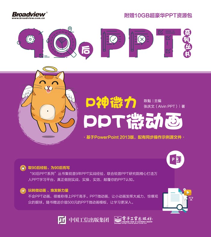 本书的所有示例和赠送模板,均属原创。随书附赠了我在演界网(Alvin PPT)开店以来更新的5 套精选模板(下载地址:www.broadview.com.cn/28552),也希望购买了本书的朋友可以关注其中的动画设置,其中会有很多本书无法详尽阐述或没有涉及到的动画制作。