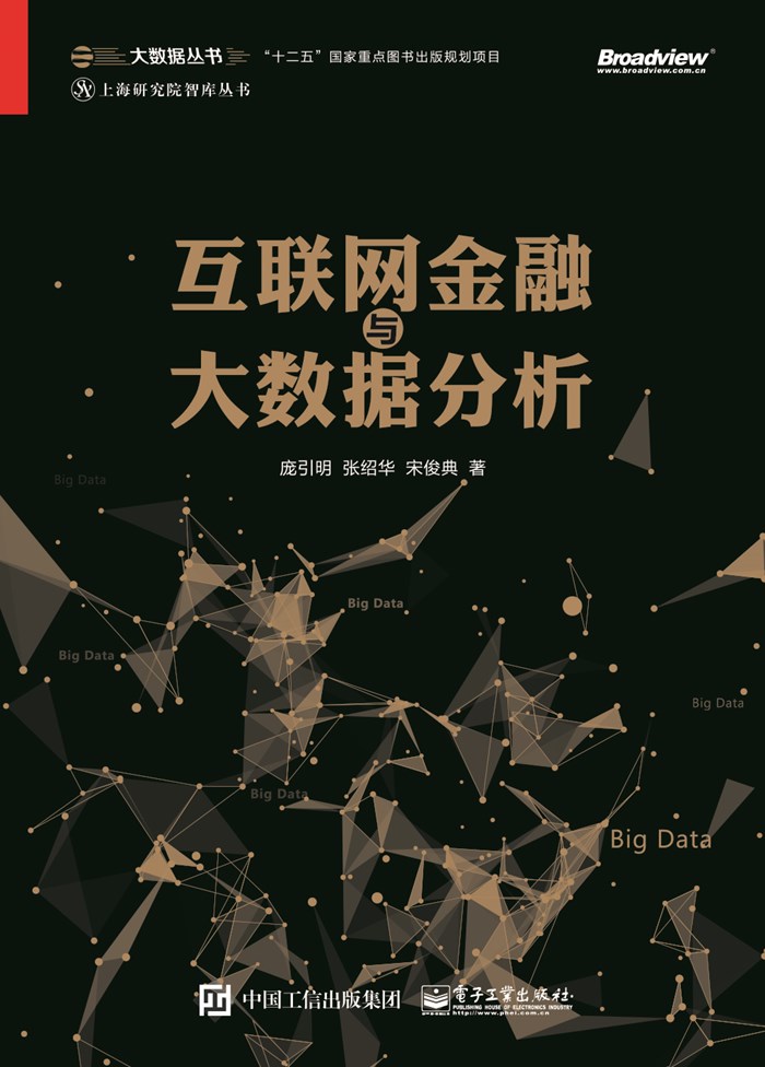 本书作为电子工业出版社规划出版的“十二五”国家重点图书出版项目“大数据丛书”中的一本,它针对的读者对象主要是:经济金融专业、管理科学和工程专业、信息技术类专业的大学高年级学生和研究生,互联网金融行业的骨干人员,金融单位的大数据分析和信息技术人员,互联网公司金融板块和大数据分析从业者,以及对互联网金融领域有兴趣、有志进入这一领域的各类人士。
