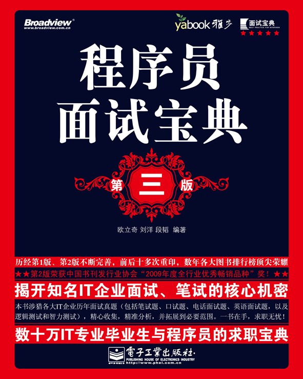 本书是程序员面试宝典的第3版。在保留原书数据结构,程序设计等主干的基础上,大量的更新了程序面试题目,取材于2009-2010各大公司面试题将替换原版的大量面试题,以反映自第2版以来近2年的时间内所发生的变化。并且修正了2年以来读者反馈的书中的一些错误和描述不当的地方。以帮助求职者们更好的处理一些新问题,新变化。
