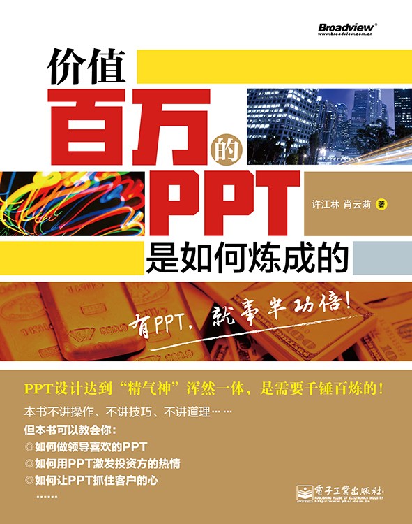 从我多年来做PPT、写PPT,以及职场磨砺、人生感悟的体验中,已经完全把工作、生活和PPT 交融在一起了,从PPT 中可以感悟工作和人生,从工作和人生中可以给我更多的PPT 创意。是的,一个优质、实用的PPT 可以价值百万,甚至超过百万,它体现在通过说服领导、老板或客户,然后获取项目批复、资金支持或销售订单上。如果你的工作正巧与此有关,那么相信你一定会有更深刻、更真实的体会。如果你的工作暂时与此无关,只是做一个简单的汇报型PPT,那么你很有必要加强储备你的技能,在需要时也许能够助你一臂之力。