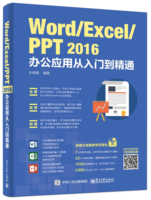 Microsoft Office是目前主流的办公软件,因其功能强大,操作简便以及安全稳定等特点,已经成为广大电脑用户必备的应用软件之一。Office 2016是Microsoft公司继Office 2013后推出的新一代办公套件,其组件涵盖了办公自动化应用的绝大部分领域,其中Word 2016、Excel 2016和PowerPoint 2016是应用最为广泛的三大组件,分别应用于文档制作与排版、表格制作与数据分析,以及幻灯片设计与制作。如今,熟练操作Word、Excel和PowerPoint软件已经成为职场人士必备的技能。