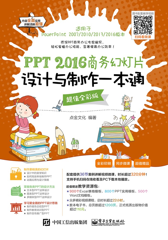 本书汇集了 20 多个经典实战案例,涉及文本型 PPT 制作、图片型 PPT 制作、图表型 PPT 制作、多媒体型 PPT 制作,以及 PPT 动画设计与应用,总结和归纳了多种常见类型的 PPT 制作方法与思路,系统地讲解了 PowerPoint 2016 商务办公的实战应用技能。同时,本书以“功能+案例+技巧”为写作线索,采用“任务驱动”的写作手法,在有限的篇幅内力争将最有价值的技能传授给读者。