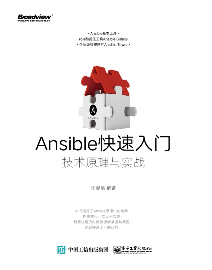 本书首先介绍了Ansible架构,然后讲解了Ansible的主要概念,接着又介绍了一些具体使用方法,步步递进、层层深入地介绍了Ansible的相关知识。