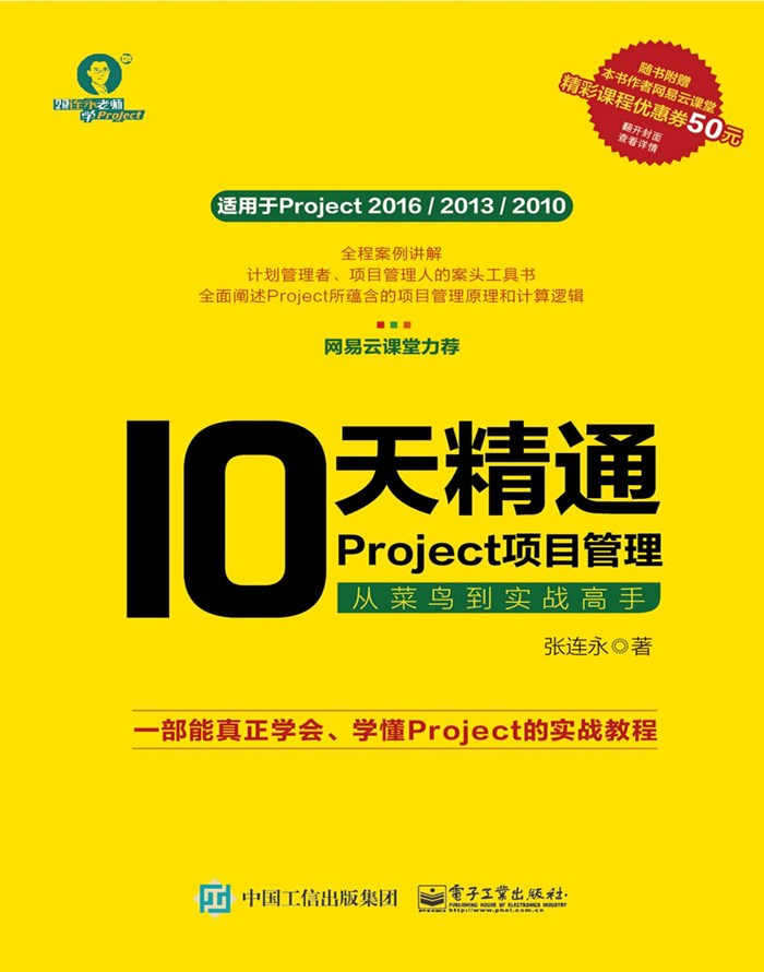 项目管理是每个人都需要适当掌握的一项技能,无论是在工作场合还是在生活中,当我们期 望有条不紊地完成一件比较复杂的事情时,项目管理的技能尤其有用。对今天的各个行业和各个 职能岗位来说,“项目”已经成了一个通用词汇,各种项目的规划和执行,几乎与每个人都密切相 关,这就使得掌握项目管理的技能变得越来越重要。 设计精良的项目管理工具,可以十倍、百倍地提升我们的效率,而且更能恰如其分地体现项 目管理背后的原理。Project 正是微软公司开发的一款专业的项目管理软件,它可以帮助我们更轻 松地规划、跟踪和监控各种项目,在使用过程中细细体会,也有助于理解项目管理的相关理论。 但是,恰恰因为其专业性,Project 入门容易,用好、发挥其强大的功能却并不容易。 张连永老师的这本《10 天精通 Project 项目管理:从菜鸟到实战高手》正是冲着这一难题而来。 这是一本非常用心的书。作者有多年的培训经验,深知如何把一门知识与技能讲得通俗易懂、深 入浅出,所以,书中专门开辟篇幅介绍项目进度和成本管理的思想和原理,同时,又将这些原理 融合到案例和具体功能的介绍中。这本书设计了一个日常生活中常见的案例——装修,以其贯穿 全文,同时,也采用了装修公司项目经理的视角,引入资源和成本管理;还有关于关键路径和视 图等功能独到而透彻的讲解…… 这本书的缘起,和网易云课堂有着密切的关系。张连永老师的 Project 视频课程于 2017 年 4 月在网易云课堂发布后,受到了极大的欢迎,让越来越多的人从新手变成了高手。受到在线教育 的鼓舞后,张老师决定重新启动搁置几年的写书计划,他将 Project 软件、项目管理原理,以及自 己丰富的项目管理实战经验相结合,写出了这本书。 张老师编写这本书的初心是帮助广大的项目管理从业者掌握 Project,提高项目管理的专业度, 这和网易云课堂的主旨——“创造更有效的学习,让每一个学习者都能获得提升”,非常契合。无 论是书籍还是视频课程,我们都希望诸位读者在 Project 进阶之旅中不走弯路,事半功倍。