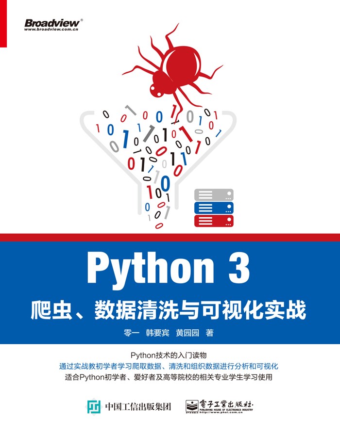 本书共分 11 章, 6 个核心主题:其一是 Python 基础入门,包括环境配置、基本操作、数据类型、语句和函数;其二是 Python 爬虫的构建,包括网页结构解析、爬虫流程设计、代码优化、效率优化、容错处理、 反防爬虫、 表单交互和模拟页面点击; 其三是 Python 数据库应用, 包括 MongoDB、 MySQL 在 Python中的连接与应用;其四是数据清洗和组织,包括 NumPy 数组知识、 pandas 数据的读写、分组变形、缺失值异常值处理、时序数据处理和正则表达式的使用;其五是综合应用案例,帮助读者贯穿爬虫、数据清洗与组织的过程;最后是数据可视化,包括 Matplotlib 和 Pyecharts 两个库的使用,涉及饼图、柱形图、线图、词云图、地图等图形,帮助读者进入可视化的殿堂。