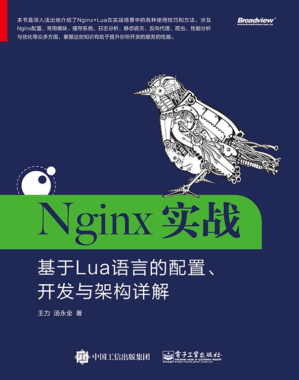 本书由王力、汤永全编写。全书内容共分18章,其中第1~5章介绍Nginx常见的配置方式,属于Nginx的入门知识;第6~10章对Nginx+Lua核心功能进行解读,是熟悉Nginx+Lua开发模式的必备知识;第11~18章是Nginx+Lua开发模式在实际业务中的实践应用,是灵活运用该模式的具体体现。