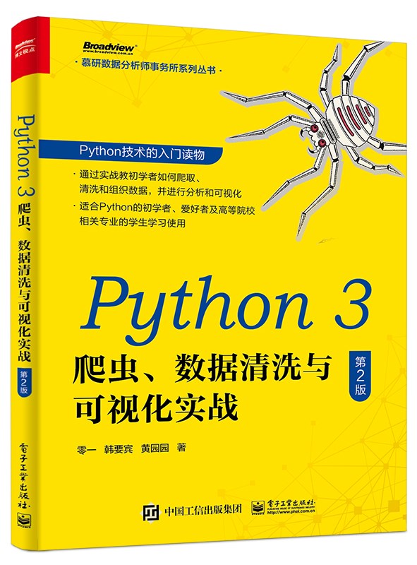 本书内容来自笔者在高校授课的内容,主要介绍如何运用Python 工具获取电商平台的页面数据,并对数据进行清洗和存储。本书简化了Python 基础部分,从而保证有足够的篇幅来介绍爬虫、数据清洗和可视化的内容。