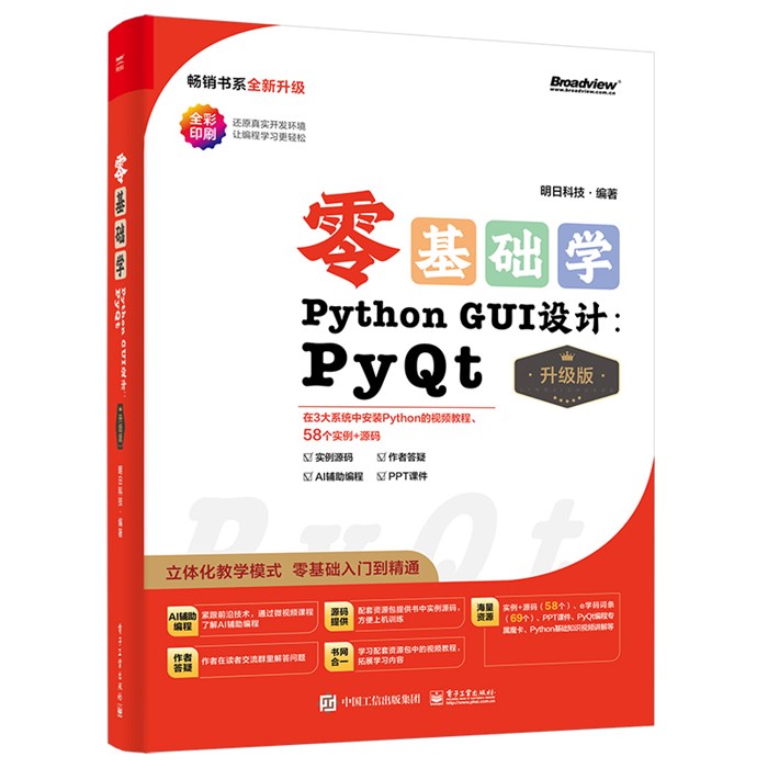 《零基础学PythonGUI设计:PyQt(升级版)》以开发Python窗口程序的PyQt6模块为主线,全面介绍了使用PyQt6设计PythonGUI程序的各方面技术。全书共分为15章,内容涉及Python与PyQt6,搭建开发环境,第一个PyQt6窗口程序,PyQt6窗口设计基础,PyQt6常用控件,PyQt6高级控件,菜单、工具栏和状态栏,对话框应用,布局管理,数据库操作,文件操作,PyQt6绘图技术,多线程编程,PyQt6程序的打包发布等。本书从用户学习与应用的角度出发,将所有的知识都结合具体实例进行讲解,对涉及的程序代码给出详细的注释,并且运用大量的示意图和实例应用,力求打造轻松、零压力的学习氛围,以便读者轻松掌握使用PyQt6进行Python GUI应用开发的精髓,快速提高开发技能,拓宽职场道路,最后将PyQt6开发知识应用于实际项目中,以便读者体验项目开发的全过程。