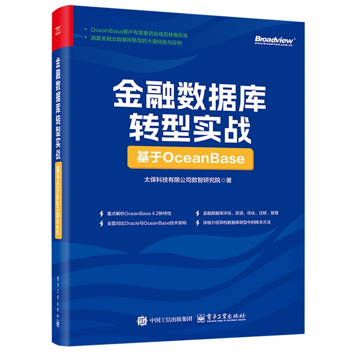《金融数据库转型实战:基于OceanBase》共10章:第1章介绍金融业务系统架构、数据库使用现状及太保的数据库转型历程;第2章介绍金融行业分布式数据库选型标准以及数据库选型考察要点;第3章重点介绍金融数据库转型降本策略,包括应用改造、测试成本、迁移成本、硬件成本、架构设计等环节,具有指导意义;第4~7章结合数据库转型实战经验以及OceanBase 4.2版本新特性,从数据库配置基线、开发规范、性能调优、管理转型等方面介绍OceanBase的最佳实践;第8~9章介绍数据库改造及迁移案例,内容翔实;第10章介绍OceanBase备份与恢复的最佳实践。