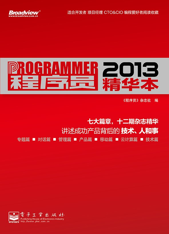 每年末《程序员》编辑部精心打造的“合订本”已经形成一个品牌,得到广大读者的认可和喜爱。今年,《程序员》杂志内容再次进行了优化整合,除了每期推出的一个大型专题策划,各版块也纷纷以专题、策划的形式,将每月的重点进行了整合,让内容非常具有凝聚力,基于原有栏目和本年度热点,《程序员2013精华本》的结构分为以下七个篇章:专题篇、对话篇、管理篇、研发实践、个人成长、产品篇、移动篇、云计算篇、技术篇。
