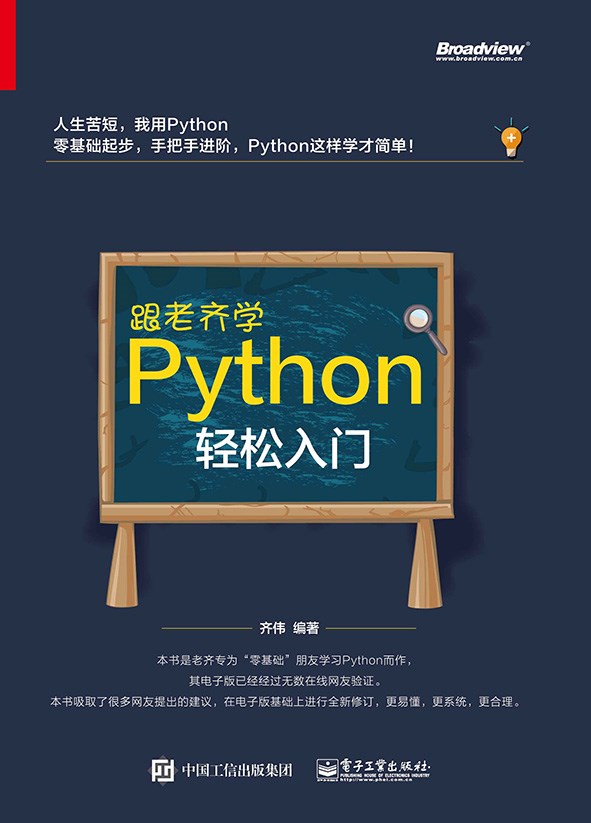 我曾经在网上写过《零基础学 Python(第 1 版)》,完成之后,发现有一些错误,并且整体结构对零基础的学习者来说还不是很适合。于是,就重新写了,后来有幸得到了电子工业出版社的认可,集结成为《跟老齐学 Python:从入门到精通》一书出版。但是,当书印出来之后,我发现还得修改,于是在原来的基础上又进行了修订,并且定名为现在的书名——《跟老齐学Python:轻松入门》,言外之意,还有入门之后的教程。
