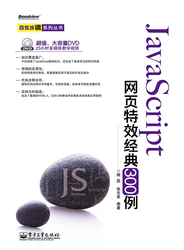 本书共24章,从JavaScript的各个方面的应用出发,为读者提供了JavaScript在方方面面开发的参考。本书的前半部分,主要展现了JavaScript在网页里的诸多特效实例,比较形象,可以让读者比较感性的了解JavaScript的作用和强大的功能,让读者知道JavaScript的基本用法,以及JavaScript是如何控制一张网页、一个按钮、一种样式、一张图片等网页里的元素的;本书后半部分,则侧重于JavaScript的高级功能和实用功能。