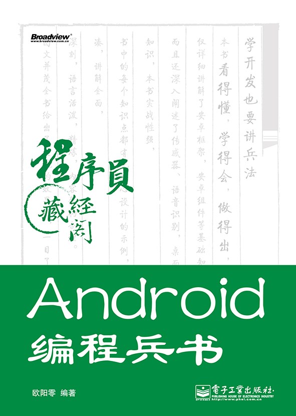 “学开发也是讲兵法!”。本书共有12章,本书主要是一本Android的基础书籍,介绍了每一个知识点的详细用法等,在通过实例对其进行巩固。本书的主要内容有:Android平台简介、Android应用程序的构成、Android布局管理器、Android常用基本控件、Android常用高级控件和事件处理、高级视图与动画、应用程序组件、Android文件存储、Android数据库存储、多媒体、通讯开发、开发实例。